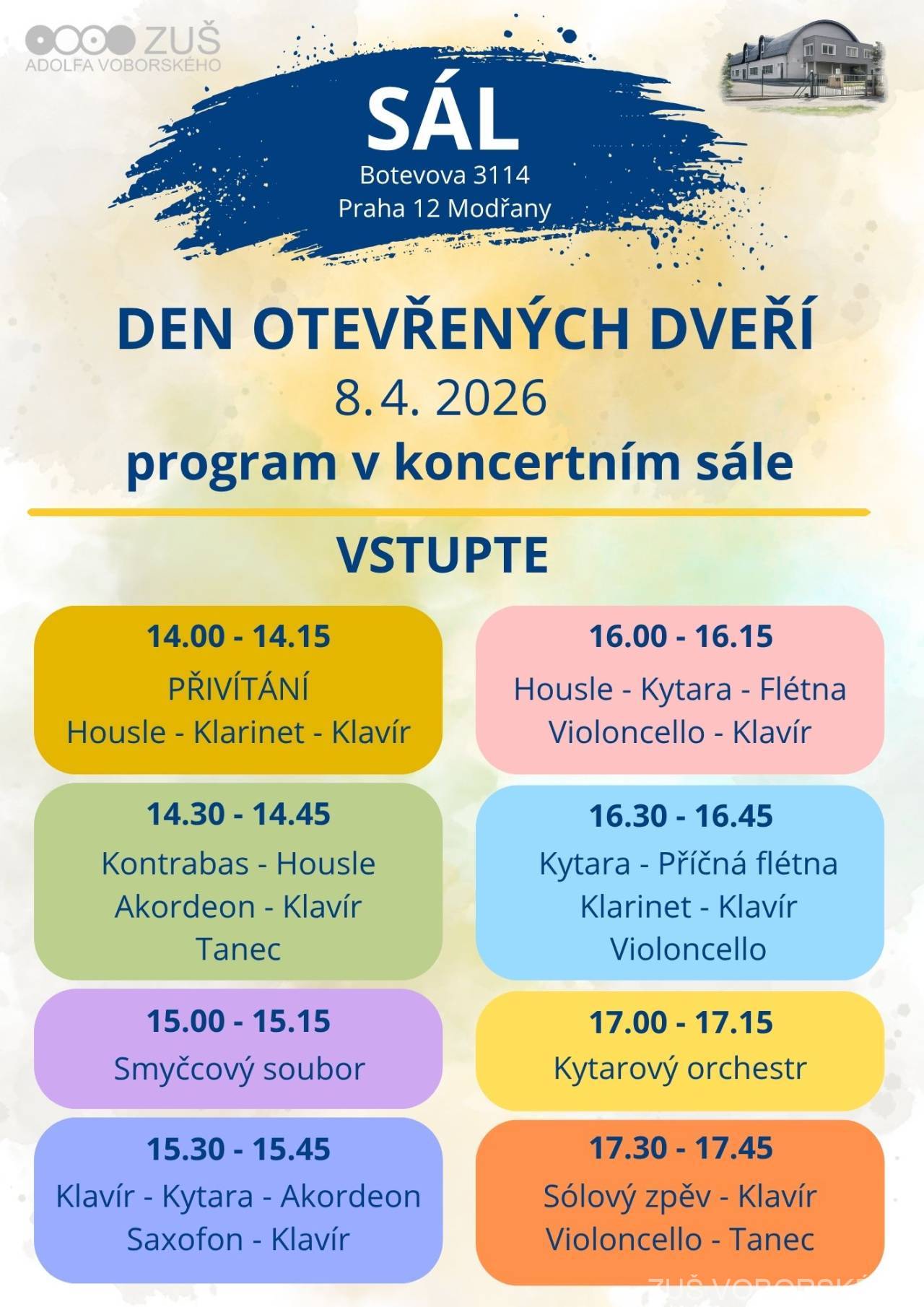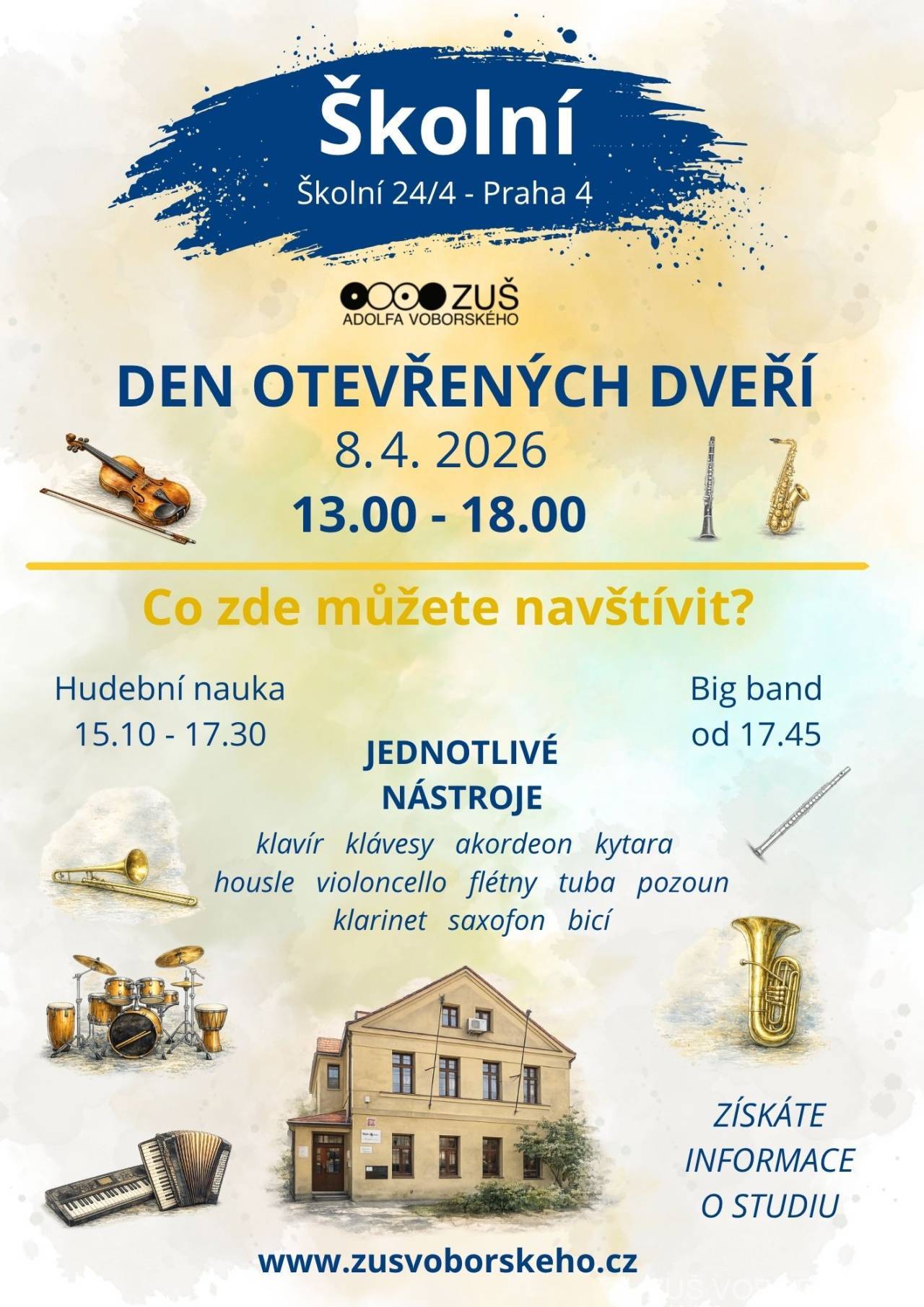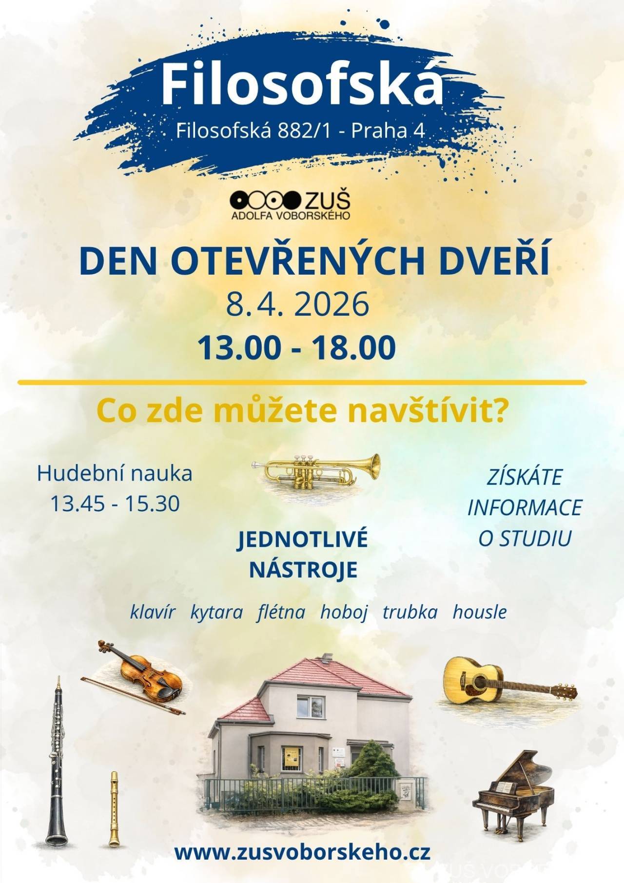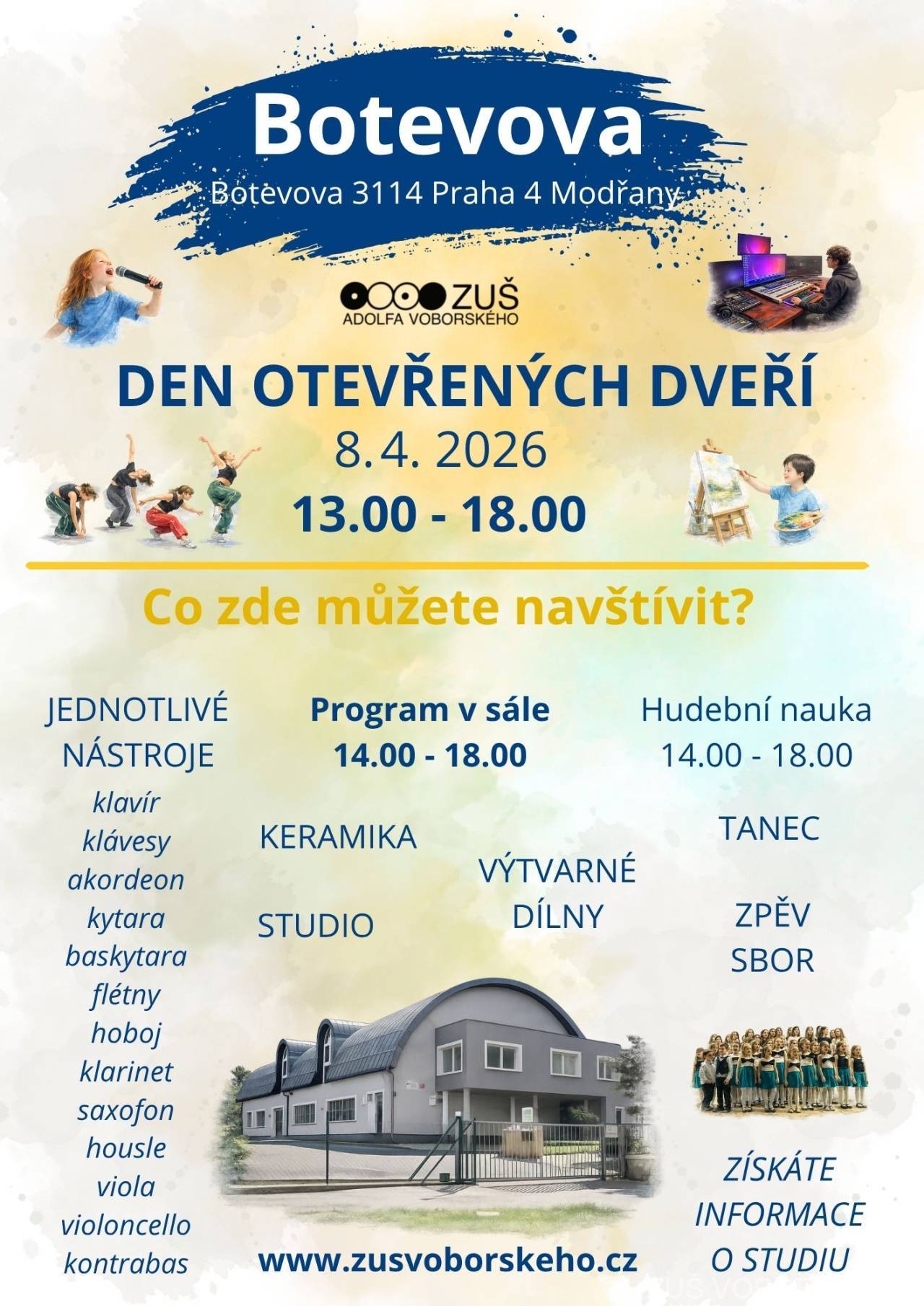 Základní umělecká škola zve všechny malé i velké zájemce na Den otevřených dveří, který se uskuteční 8. dubna 2026 v odpoledních hodinách od 13.00 do 18.00 v budovách školy na adrese Botevova 3114, Praha 12 – Modřany, Filosofská 882/1, Praha 4, Školní 24/4, Praha 4. Akce nabídne jedinečnou příležitost nahlédnout do každodenního života školy a poznat její atmosféru zblízka.