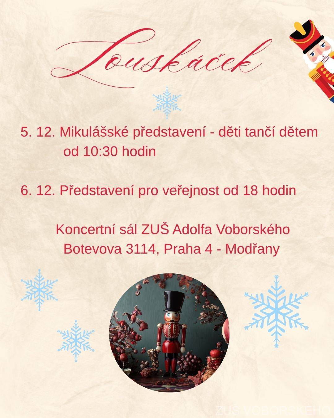 Louskáček - vánoční příběh plný fantazie a magické atmosféry v podání našeho tanečního oddělení pod vedením Terezy Burešové. Premiéra 5. 12 2025 jako mikulášské představení pro MŠ a ZŠ, podruhé 6. 12. 2025 pro širokou veřejnost v koncertním sále ZUŠ. Přijďte prožít vánoční atmosféru a podpořit naše tanečníky a tanečnice!